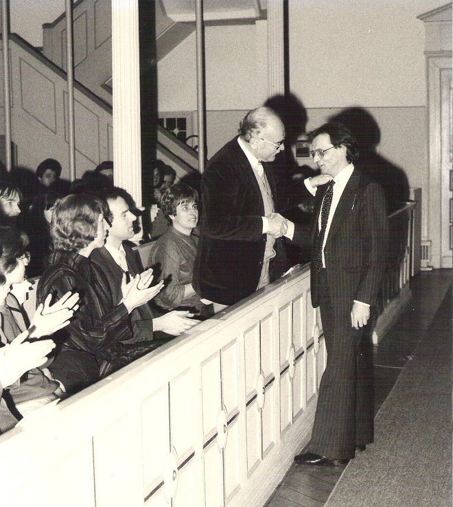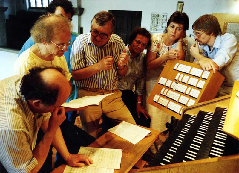| Darmstädter Ferienkurs mit Odile Pierre, Alois Pinos (4. von rechts) und René Wohlhauser (1. von rechts) 1988 |